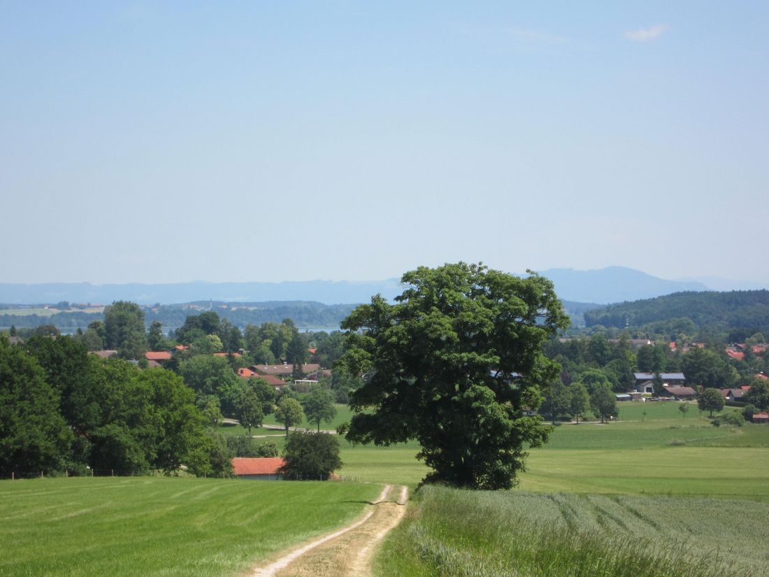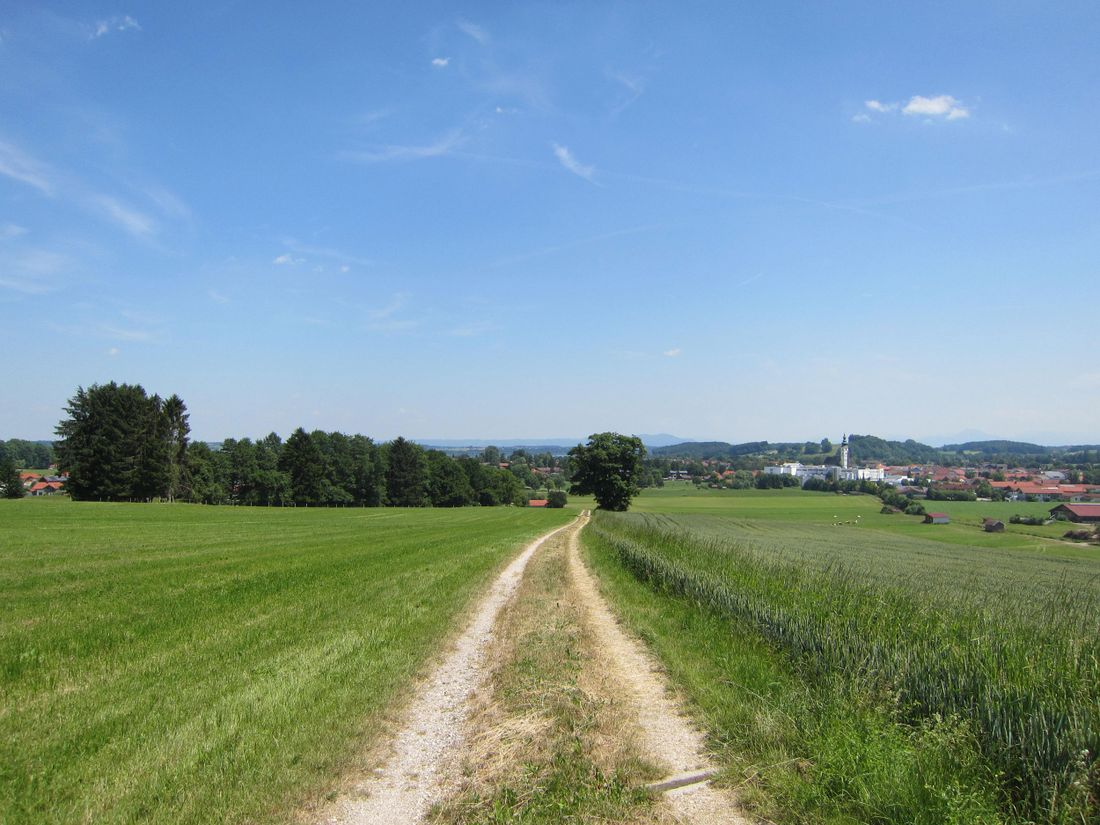 When the forest clears, you have a wonderful view over the meadows and forests to the Chiemgau Alps. Several benches adorn the edge of the path and invite you to linger. To get to Waging, turn your back on Oberleiten and follow the dirt road to Gessenberg . Gessenberg Castle can only be viewed from the outside, as it is privately owned, but you can visit the castle chapel . After Gessenberg, the path branches off to the left and in the forest the hiking trail goes off to the right. When you leave the whale piece, you reach the center of Waging again.