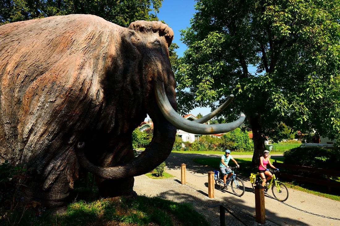 Unnoticed you pass the highest point of the tour at 806 meters. The long descent is the reward for the effort. Even in prehistoric times, this and similar paths were used for long hikes. It goes along the Windbach, on to the Ruhpolding golf course and along the Weißen Traun, north towards Siegsdorf. Sometimes the turquoise blue water of the river is in sight, sometimes it disappears behind dense trees or below small slopes. On quiet side roads you come to Vordermiesenbach and through the "Extensive meadows around Ruhpolding bird sanctuary". During the hay harvest, a beguiling scent of meadow herbs and blades of grass hangs in the summer air. The view stretches back over the entire Ruhpolding valley . After Hörgering, a district of Eisenärzt, you cross the main road and a bridge to the western bank of the Weißen Traun. Through a beautiful Au landscape it goes to Siegsdorf. Here you get very close to the mammoth and the ice age. The largest mammoth skeleton in Europe was found in Chiemgau. It is exhibited in the mammoth and natural history museum in the middle of town. You can't overlook it from the bike and drive right past it. If you're lucky, museum director Dr. Darga on the Ice Age in the region.