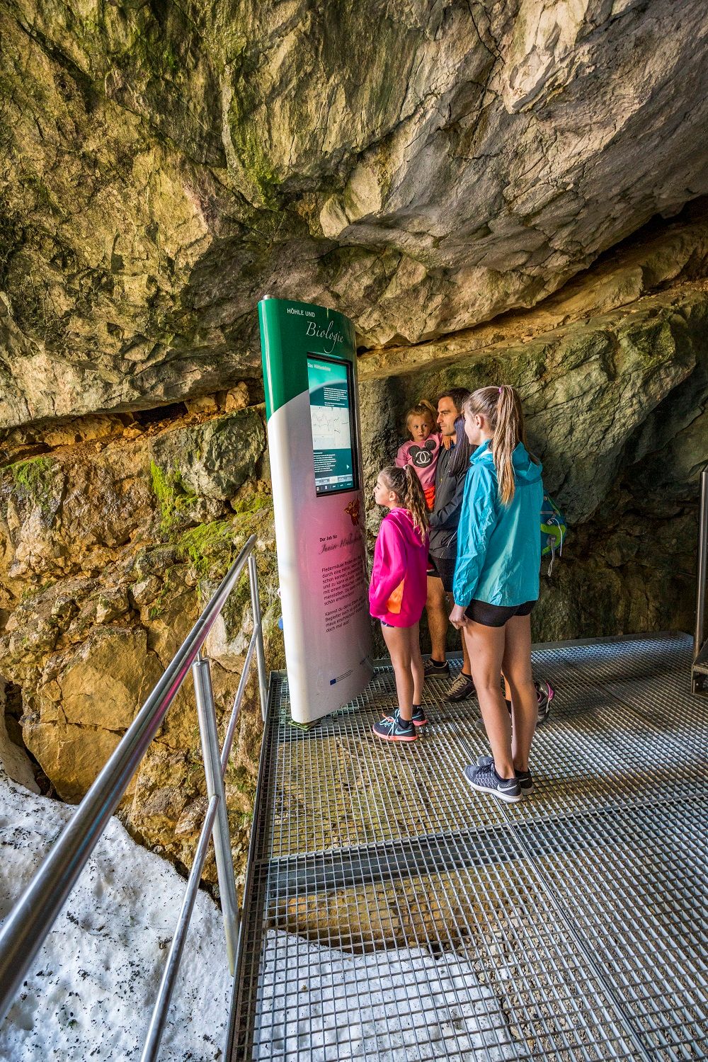 The entrance to the cave is just behind the cog railway mountain station. There it goes down 82 steps through the artificial access tunnel. At the bottom, a path leads into the imposing cathedral , if you follow the path in the other direction you reach the natural cave entrance and the so-called cold trap , where there is snow all year round.