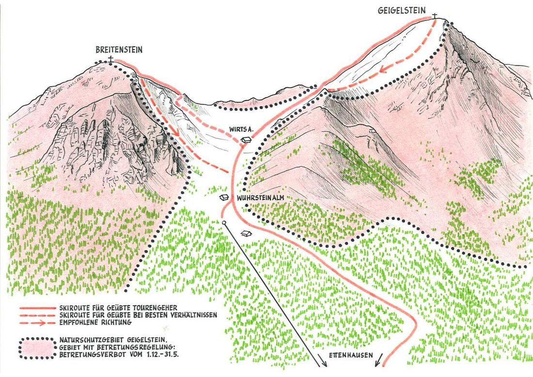 Tipp: Vor der Tour bitte unbedingt den aktuellen Lawinenbericht prüfen, Lawinenausrüstung einpacken, bei schönem Wetter nicht vergessen: Sonnencreme, bitte die Naturschutzgebietsgrenzen und Regeln im Naturschutzgebiet Geigelstein im voraus durchlesen.