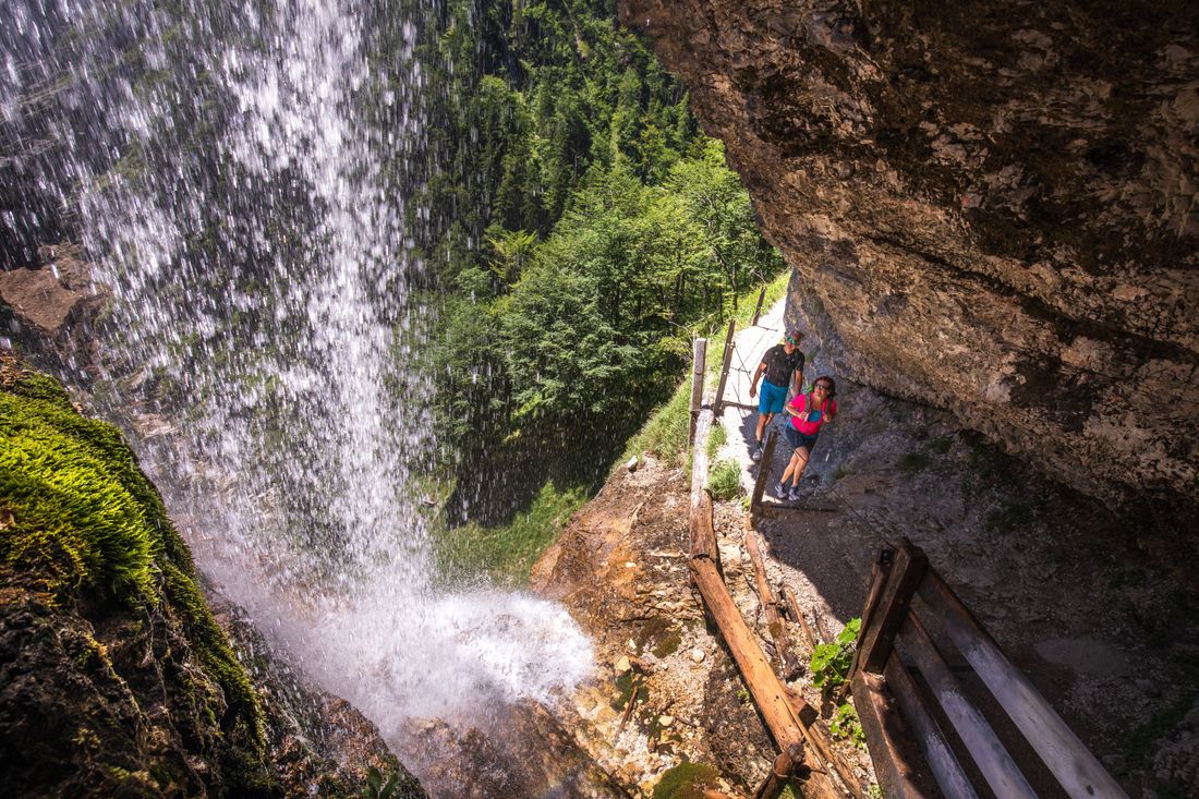 Der Staubfall markiert die Grenze zwischen Bayern und dem Salzburger Land. Rund 200 Meter donnern die Wassermassen über Felsen hinab. Treppenstufen verlaufen direkt hinter dem Wasserfall. Ein Holzdach sorgt dafür, dass man trotzdem trocken bleibt. Einst brachten hier Schmuggler Zigaretten und Kaffee über die Grenze. Bis in die 1950er Jahre gingen Zöllner Streife, um ihnen Einhalt zu gebieten und Wanderer mussten an einer kleinen Diensthütte ihre Ausweise vorzeigen. Längst können sie ungehindert ins österreichische Heutal hinübergehen und zurück. Die Tour ist an einigen Stellen steiler ansteigend, viele Serpentinen führen hinauf und man sollte trittsicher sein.